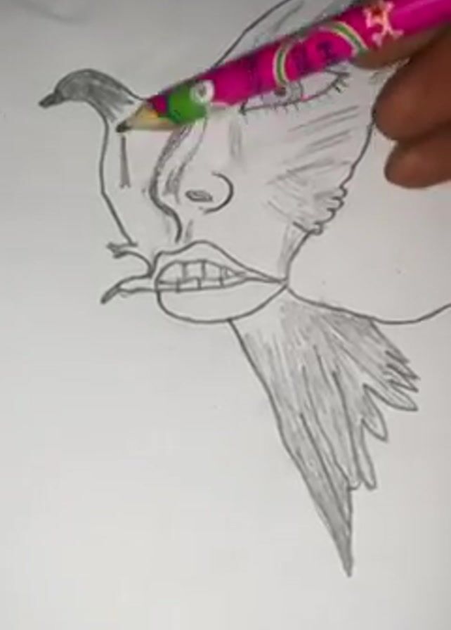 A hand holding a pink pencil is shading in a drawing of a person with elements of a bird. The person has a bird-like head on the left side and feathers underneath. The face is grotesque, with a large nose and teeth. The drawing is on a white piece of paper.
