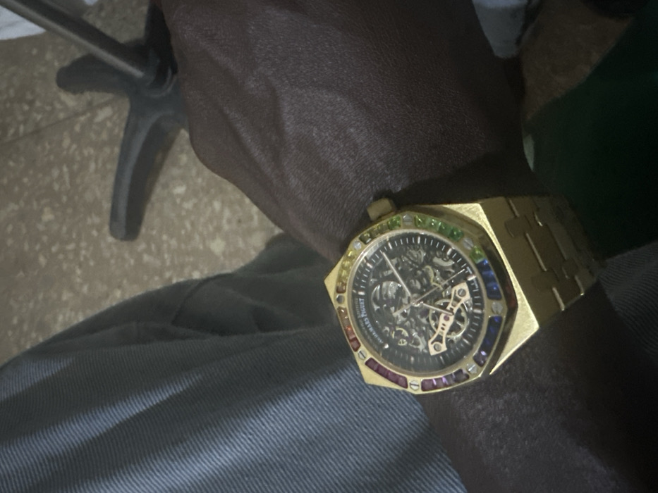 - "A person wears a gold Audemars Piguet Royal Oak watch with a rainbow gem-set bezel on their left wrist" by FM-BxwLM2, licensed under CC BY 4.0