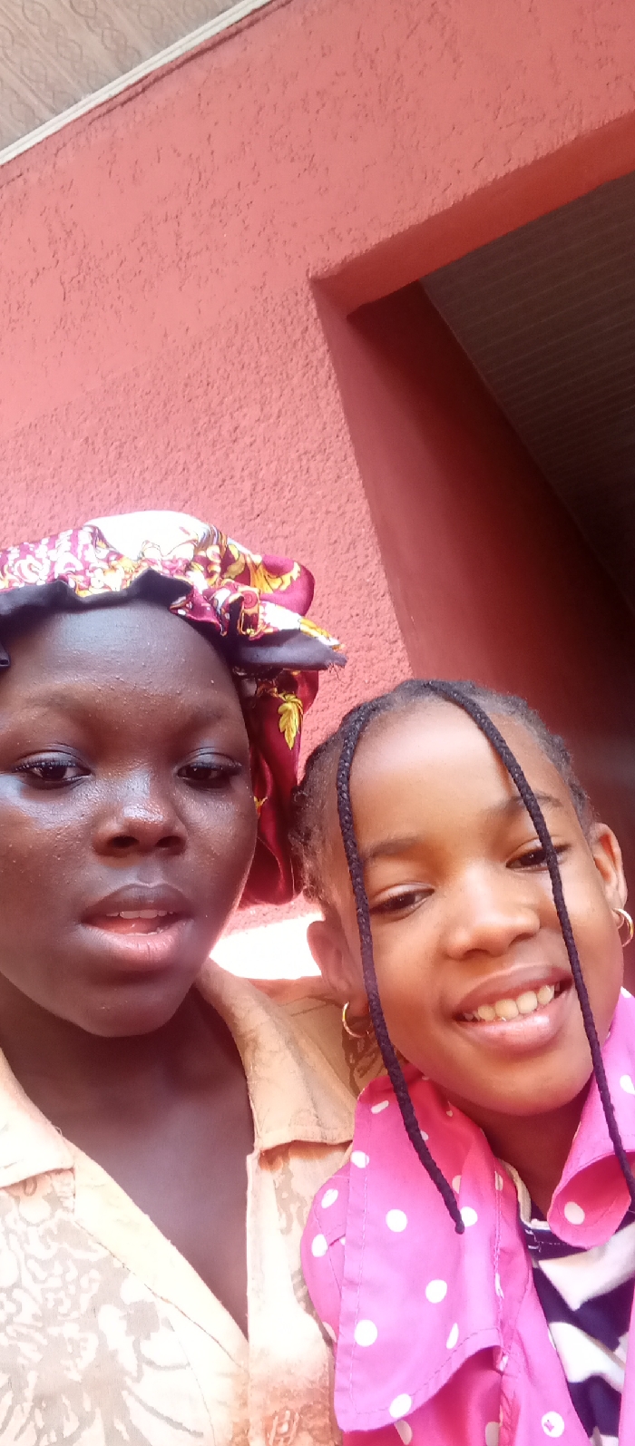 Two females are depicted in a close-up, chest-up portrait against a reddish-pink stucco-textured wall. The location is stated as Udi, Nigeria, though this is not visually verifiable from the image data. The subject on the left is an older female with dark skin, wearing a dark red and gold patterned head covering resembling a bonnet, and a light brown or tan patterned shirt. Her mouth is slightly open, and her gaze is directed towards the camera. The subject on the right is a younger female with lighter skin, featuring braided hair pulled back, with several braids falling forward over her shoulders. She wears small gold hoop earrings in both ears. Her attire consists of a bright pink shirt with white polka dots, worn over a dark garment with white geometric patterns. She is smiling, revealing upper teeth, and her gaze is directed towards the camera. The background comprises the reddish-pink textured wall, with a corner or doorframe visible on the right, showing a dark, possibly brown, recessed area. A light-colored ceiling or upper wall section with a repeating pattern is visible at the top left. The subjects are positioned in close proximity, suggesting an posed interaction.