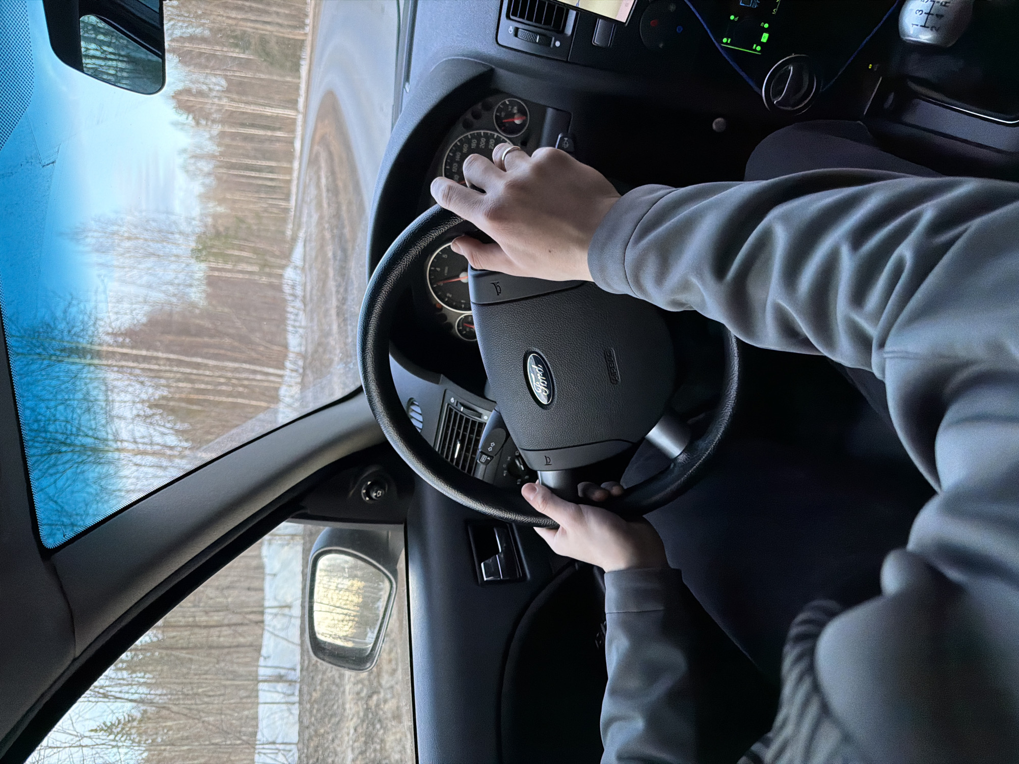 The image depicts the interior view from the driver's perspective of a Ford vehicle, likely in a rural or semi-rural setting in Unknown, Russia. The driver's hands are positioned on the black steering wheel, which features a Ford logo. The driver wears a light gray long-sleeved garment and dark trousers; a plain silver ring is present on the fourth finger of the right hand. The dashboard is visible behind the hands, displaying a speedometer calibrated to 220 km/h and a tachometer. To the right, a manual gear stick is partially visible, indicating a 5-speed transmission. The windshield shows a slight blue tint and a minor crack in the upper central area. Outside the vehicle, a paved road curves gently to the right, bordered by snow-covered ground and barren deciduous trees, predominantly birches, interspersed with some conifers. The background suggests a winter or early spring environment. Sunlight appears low, casting a warm glow on some distant tree trunks and reflecting in the driver's side mirror. A rearview mirror is visible, reflecting the sky and trees. The overall scene indicates the vehicle is in motion or stationary on a forested road under a clear or lightly overcast sky.