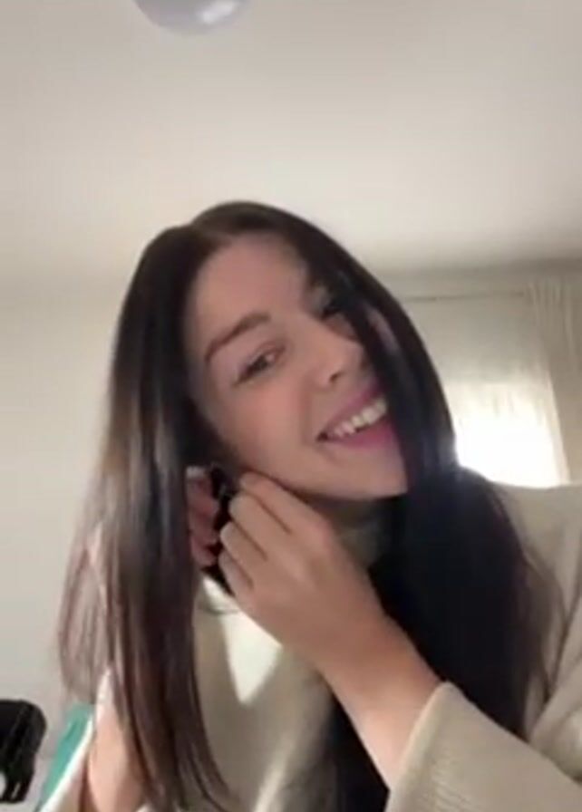 woman putting on an earring. She is fair-skinned, has long dark hair, and is wearing a light-colored sweater. She smiles as she tries to put in the earring. The room is well-lit with a ceiling light and a window with white curtains visible in the background.
