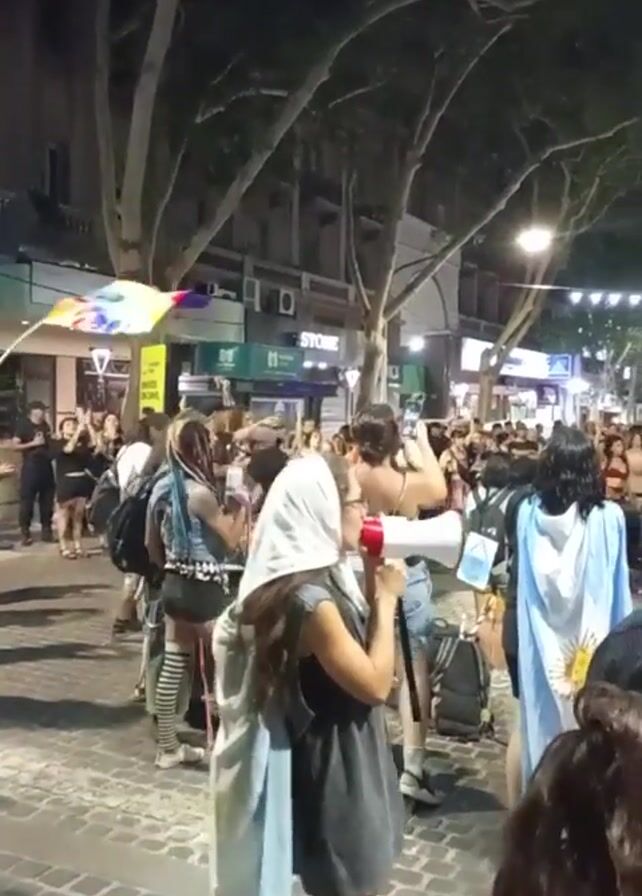 At night, a crowd of people is gathered on a city street, with many trees lining the road. String lights and street lights illuminate the scene. A person in the foreground uses a megaphone, while another holds a rainbow flag high in the air. Some individuals in the crowd are dancing, while others carry items like backpacks or suitcases. The overall atmosphere appears festive, possibly indicating a demonstration or celebration.