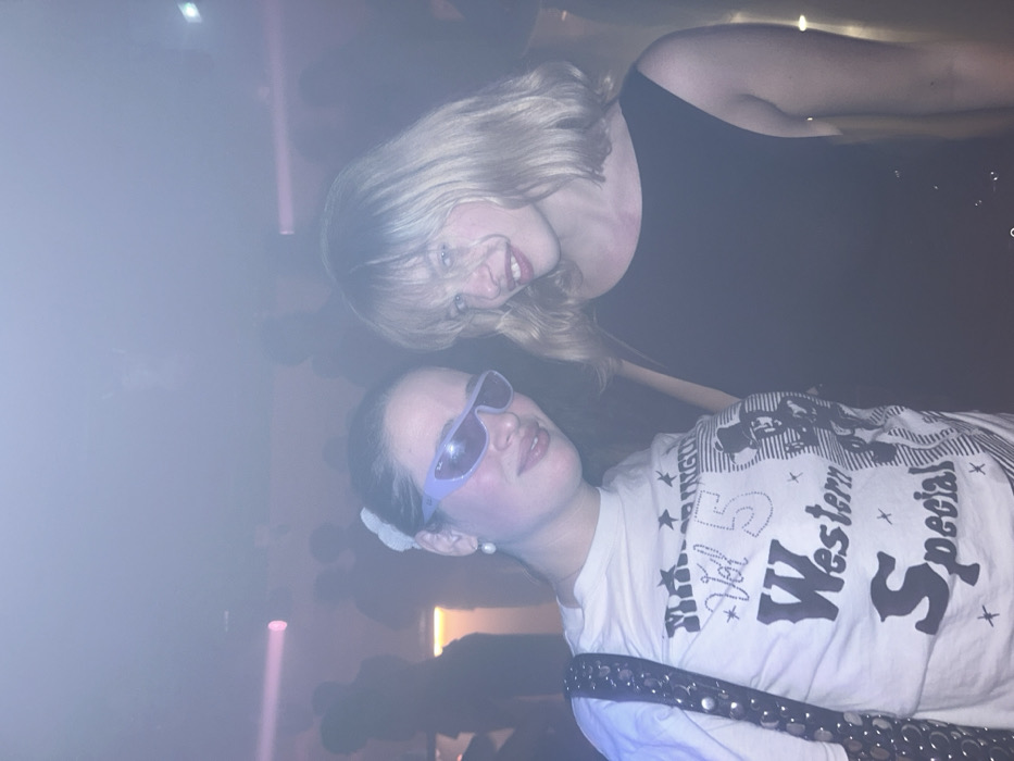 Two young women are depicted in a dimly lit, hazy indoor environment, consistent with a nightclub or bar setting. The exact location within Paris, France, cannot be determined from the visual information. Both subjects are looking towards the camera with slight smiles. The woman on the left has dark hair, styled with a white accessory, and wears light purple wraparound sunglasses. She has a pearl earring visible on her left ear. Her attire consists of a white short-sleeved t-shirt featuring graphic text including "Vol 5 Western Special" and an illustration of a cowboy. A dark shoulder bag with prominent metallic studs or rings is slung over her left shoulder. The woman on the right has blonde, shoulder-length hair with bangs and is wearing a dark, sleeveless dress with a rounded neckline. The background is out of focus and characterized by atmospheric haze, low light, and diffused pink or purple illumination, with indistinct silhouettes of other individuals visible, suggesting a crowded venue.