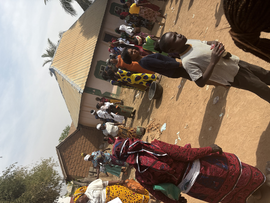 A gathering of people is visible outside a building. Many individuals are wearing colorful, patterned fabrics or traditional attire. A young boy in a striped shirt and dark pants stands prominently in the foreground, appearing to observe the scene. The surrounding environment is an outdoor area with dirt ground and some foliage. The building has a simple structure and corrugated metal roof, with light-colored walls.