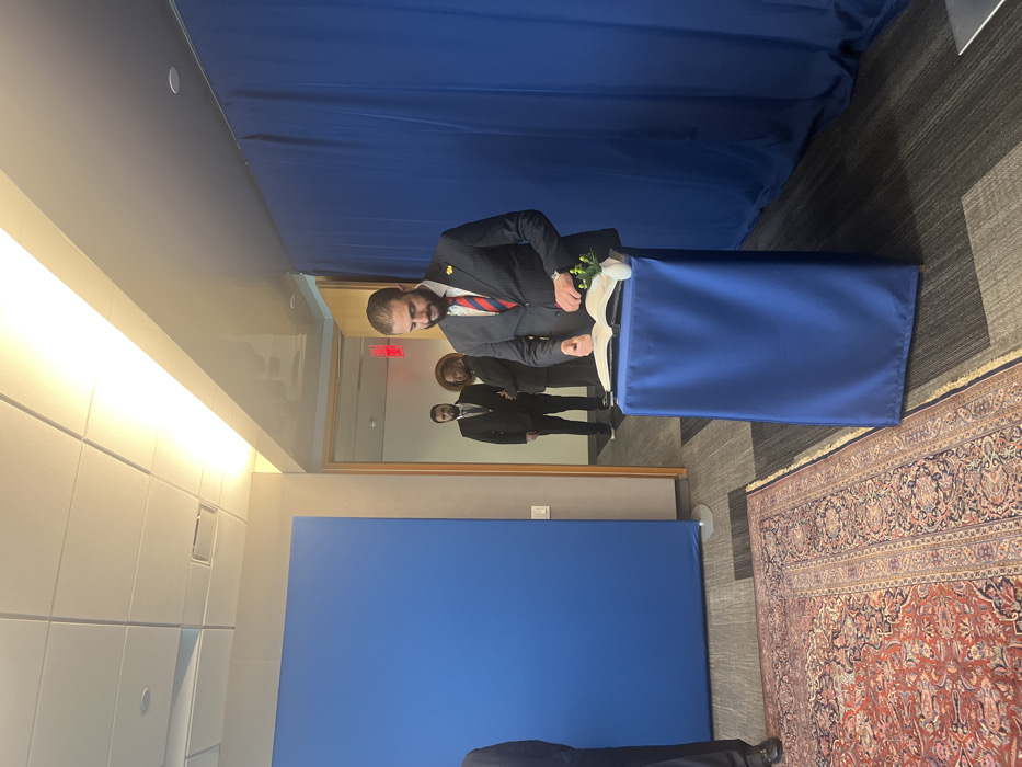 The image depicts an indoor event space within an office or public building in New York City, United States. Precise street address or specific internal landmarks are not identifiable from the image. In the foreground, a light-skinned male with a dark beard and dark hair, wearing a dark pinstripe suit, white dress shirt, and red and blue striped tie, stands centered slightly to the right. He is leaning forward, hands positioned over a large, open book resting on a blue-draped podium, appearing to sign, read, or turn pages. A small white vase containing green foliage is placed to the right of the open book on the podium. The floor is carpeted with a pattern of alternating dark and light grey squares. A large, ornate Persian-style rug with red, blue, and cream patterns covers a portion of the left foreground. Walls are light-colored, and overhead fluorescent lighting fixtures are visible on the ceiling. On the far left, two vertical royal blue fabric-covered panels are positioned. On the far right, floor-to-ceiling royal blue drapes hang. Through an open doorway in the background, a brightly lit corridor is visible. Two individuals are standing within this corridor, observing the scene: a light-skinned male with a dark beard wearing a dark suit, and a dark-skinned female with voluminous hair wearing a dark jacket. A red, illuminated "EXIT" sign is visible above the doorway. A partial view of another individual in a dark suit is visible on the far left edge of the image, cropped at the chest.