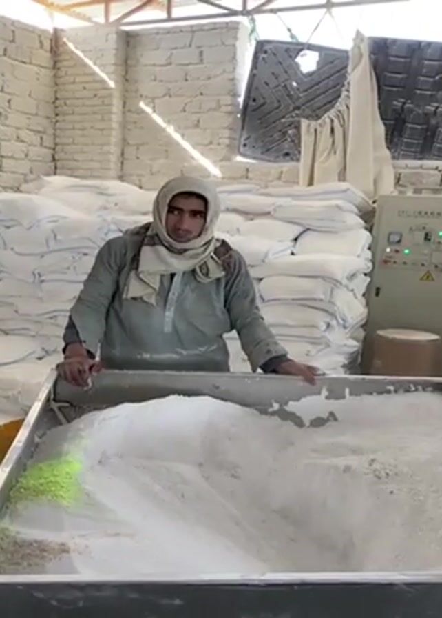 In a brightly lit indoor space, likely a manufacturing facility, a person stands beside a large, rectangular metal container filled with a white powdery substance. A small amount of bright green powder is visible along one edge. The person, dressed in a light-colored, long-sleeved shirt and a headscarf, looks towards the camera with a neutral expression. The person's hands rest on the edges of the container. Behind the person, stacks of white sacks are piled against a white brick wall. To the right of the sacks, a beige electrical control panel is visible with several buttons and indicator lights. The space appears to be covered, with visible beams and skylights allowing sunlight to filter in.