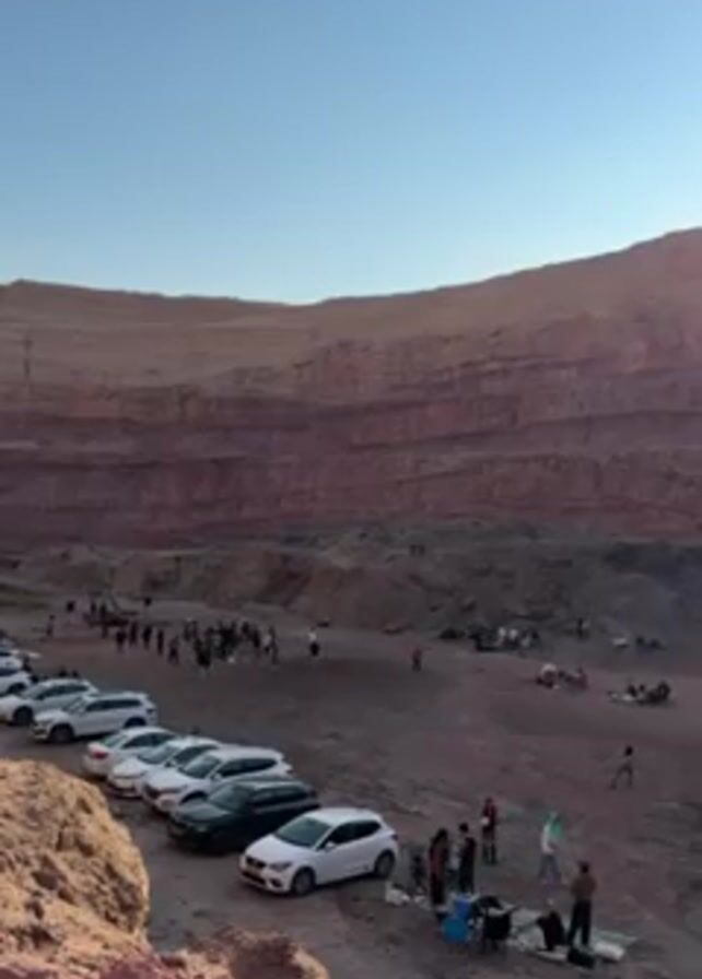 group of people gathered in what appears to be an old quarry or a similar excavation site with layered rock walls. A line of parked cars is visible on the edge of the quarry, and people are milling around, some seemingly picnicking or setting up areas to relax. There's music playing, creating a festive or relaxed atmosphere. The quarry walls are a reddish-brown color, and the sky is clear and blue, suggesting it is daytime.