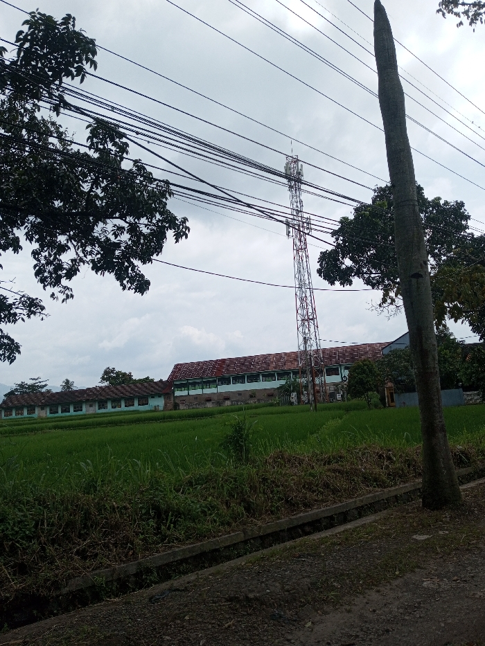 The image displays an outdoor scene in Khajuripada, India, under a cloudy, overcast sky. In the foreground, a rough, dark dirt or gravel surface occupies the lower right, transitioning to a concrete-lined drainage ditch that extends horizontally across the lower-mid frame. Immediately beyond the ditch is a strip of overgrown green weeds, which then gives way to a wide, vibrant green agricultural field, consistent with rice paddies, stretching towards the background. In the mid-ground, a long complex of buildings is situated behind the field. These structures feature multiple sections with light blue or teal-colored window panels on their lower levels and reddish-brown corrugated metal roofs. A tall cellular telecommunication tower, constructed from white and red lattice sections and topped with antenna arrays, stands prominently in the center-right. Another building with a dark roof is partially visible to the right of the tower, partially obscured by foliage. Overhead, multiple black utility wires traverse the sky. Dense, dark green foliage from a tree branch extends into the upper left quadrant, partially obscuring the wires. On the far right, a thick, light-colored tree trunk stands vertically, partially cropped. In the distant background on the left, faint outlines of hills or mountains are visible beneath the uniformly grey sky. No individuals, actions, or direct interactions are visible in the scene.