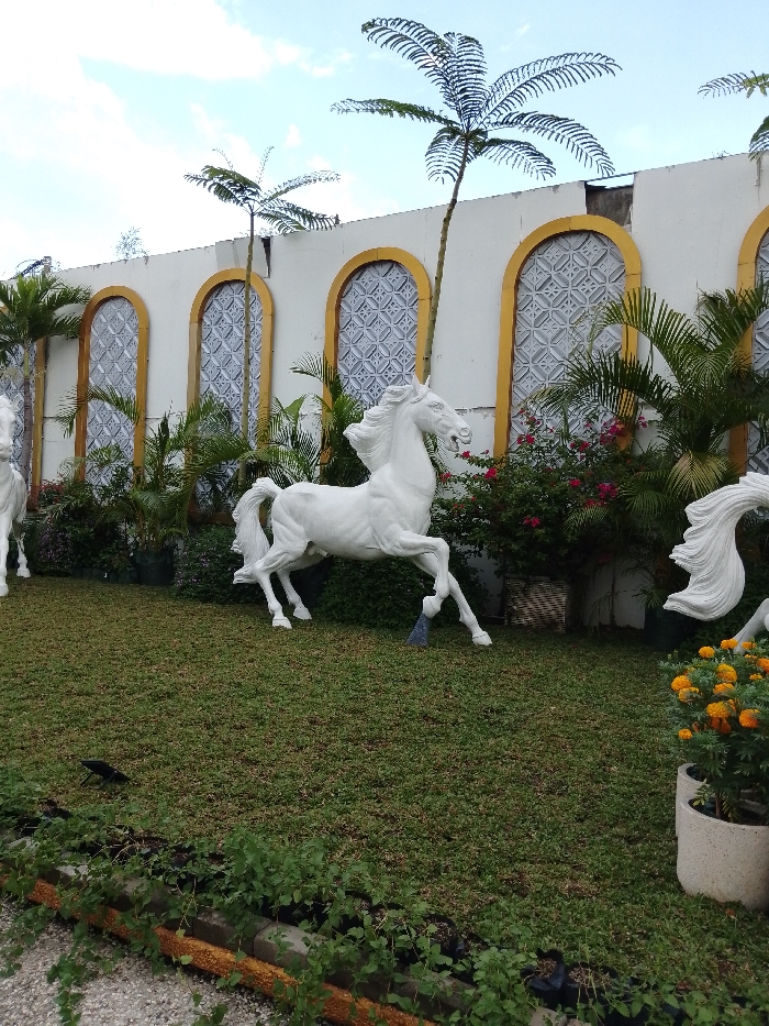 The image depicts an outdoor garden scene within the city of Ngadirejo, Indonesia. The central subject is a white, life-sized statue of a horse in a dynamic pose, appearing to gallop or rear with its left front leg raised and supported by a dark blue-grey stand. A portion of another white horse statue's head is visible on the far left, and the tail of a third statue is on the far right. The ground is covered with neatly maintained green grass. In the background, a tall, white wall features multiple arched recesses or decorative windows, each framed by a gold-colored border and containing a white, patterned lattice insert. Above the wall, a partly cloudy sky is visible. Several types of vegetation populate the scene: tall, slender palm-like trees with feathery fronds ascend from behind the horse statues and rise above the wall. Dense green foliage and bushes with clusters of red and pink flowers are situated behind the horse statues and in front of the wall. On the far right, a potted plant with numerous bright orange flowers (resembling marigolds) is visible. Additional green plants and shrubs are interspersed throughout the garden, with some smaller leafy plants growing along a stone and textured brown border in the foreground. A dark-colored object, possibly a landscape light, is present on the grass in the lower-middle left. No individuals are present in the scene.