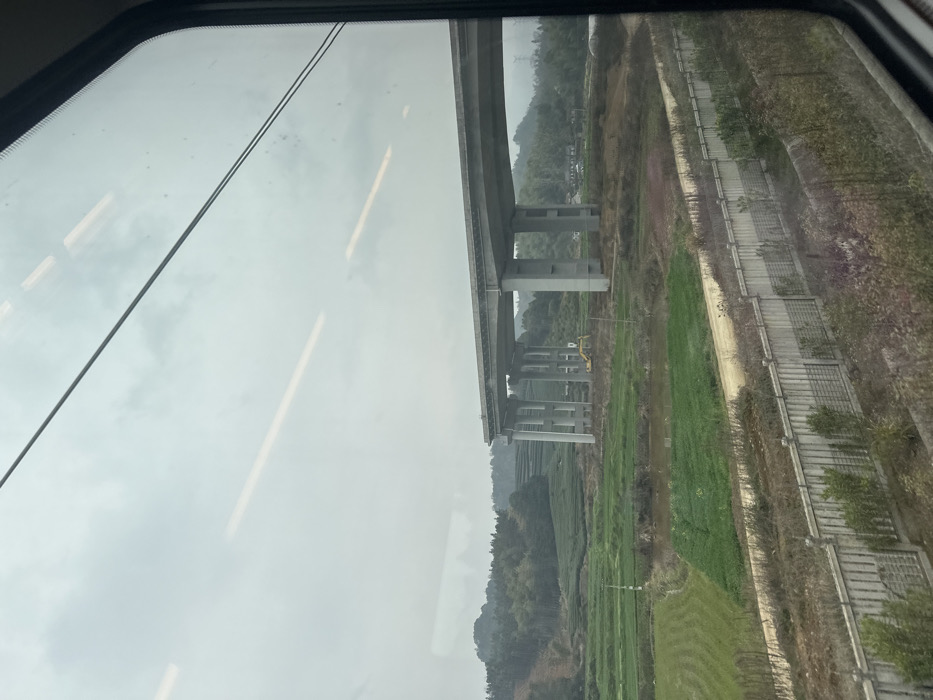The image depicts an expansive view from inside a vehicle, likely a train, showcasing an ongoing infrastructure development project within a rural or exurban area of Fuyang, China. The sky is uniformly overcast and light gray. In the midground, a substantial, unfinished elevated concrete highway or bridge structure dominates the scene. This structure is supported by multiple robust, gray concrete piers, with a broad, flat concrete deck extending horizontally. The left end of the deck appears incomplete, exposing construction elements. Directly beneath the bridge, a yellow excavator is positioned on a patch of disturbed earth, indicating active construction. The landscape surrounding the bridge features a mix of agricultural activity and undeveloped land. Lush green fields, likely crops, are visible in various plots, interspersed with areas of brown soil and dirt paths. A small, dark body of water, possibly a pond or irrigation ditch, is located to the left of the bridge piers. In the background, rolling hills rise, covered with a combination of sparse trees and what appear to be terraced tea plantations. The distant horizon is indistinct under the overcast conditions. The foreground of the image includes a light gray concrete barrier or fence running horizontally, partially obscured by dry, sparse vegetation. Overhead wires and reflections of interior lights are visible on the windowpane, consistent with the viewpoint from a moving vehicle. No individuals are discernible in the scene.