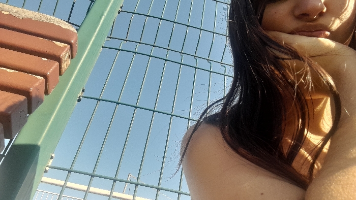 The image depicts an outdoor scene under a clear blue sky, featuring a person and structural elements. On the left, a section of a weathered wooden bench with horizontal brown slats is visible, connected to a green metal support. A prominent green metal wire mesh fence spans the midground, with additional lighter-colored metal grating structures visible behind it. On the right, a close-up shows the right side of an individual's face, including the nose, mouth, and chin, with long dark hair partially obscuring the view. The individual's right hand supports their chin. Bright sunlight illuminates the scene, creating distinct shadows on the person's neck and beneath the chin. The specific location within Strasbourg, France, is not discernible from the visual elements presented.