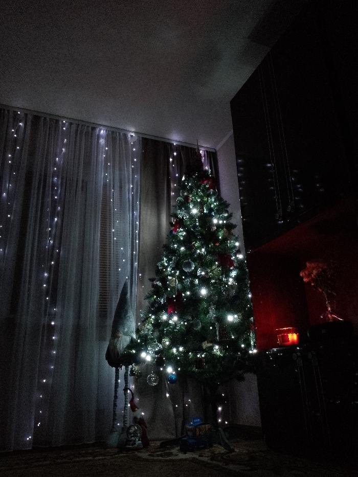 A dimly lit room showcases a decorated Christmas tree, adorned with lights and ornaments. To the left, sheer curtains hang with string lights, adding to the festive ambiance. A gnome figure stands near the tree's base. To the right, a dark cabinet displays a vase with dried flowers, illuminated by a warm-toned candle. The overall scene exudes a cozy, holiday atmosphere.