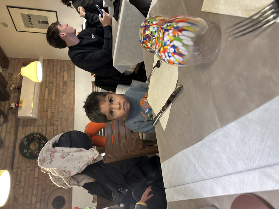 The image depicts an indoor scene within a restaurant in Venice, Italy. In the central foreground, a young child with dark hair is seated at a table, wearing a grey long-sleeved t-shirt with an orange graphic and "ADVENTURE" text. The child looks directly at the camera with a neutral expression. The table is covered with a light grey paper or fabric tablecloth, featuring white paper napkins, a silver knife, and two forks. Two clear, inverted glasses with distinctive multi-colored speckle patterns, characteristic of Murano glass, are positioned on the table to the right of the child. To the child's left, a black stroller or bag is partially visible, draped with a white blanket patterned with pink roses. In the mid-ground to the right, a young adult male with brown hair, wearing a black Nike sweatshirt, is seated at an adjacent table. He is looking to his left and holding a smartphone. The background features a brick wall adorned with a green wreath bearing a "MERRY CHRISTMAS" sign, and a circular metallic wall decoration to the left. To the right, a framed black and white image of an architectural structure is mounted on a lighter wall section. The ceiling reveals wooden beams and yellow pendant lights. An air conditioning unit, with a small Mickey Mouse figurine perched on top, is mounted on the brick wall between the wreath and the framed print. The overall environment is a casually furnished dining space with festive accents.