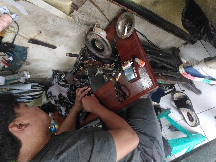 The scene depicts an indoor tailoring or mending workshop, likely located in Sindanglaya, Indonesia
