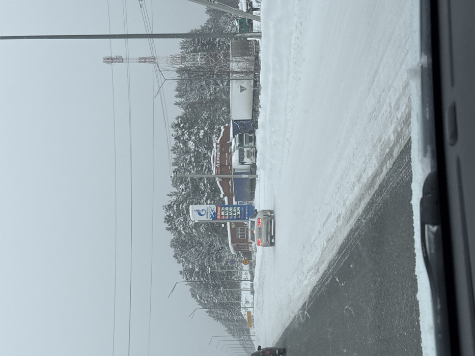 The image depicts a snow-covered winter scene in Nizhny Tagil, Russia, viewed from inside a vehicle looking forward. A two-lane asphalt road, partially cleared of snow and ice, runs from the foreground into the midground. The shoulders and surrounding terrain are entirely blanketed in deep snow. In the midground, a light-colored sedan with illuminated taillights proceeds away from the viewer on the right lane of the road. A dark vehicle is partially visible in the left lane, closer to the foreground. To the right of the road, a Gazprom gas station complex is visible, consisting of a vertical blue and white price sign displaying fuel prices (e.g., 95 at 54.70, 92 at 51.30, DT at 65.90, 80 at 51.60). Adjacent to the sign are two red-brick buildings: a gas station structure to the left and another building labeled "АвтоШиК" (AutoShik) to the right. Several large semi-trailer trucks, primarily blue cabs with white trailers, are parked in front of and to the right of the buildings, indicating a service stop. A green truck is partially visible further right. A dense line of snow-covered coniferous trees forms a forest directly behind the service complex. Power lines and utility poles traverse the sky above the road and forest line. A tall, red and white lattice cellular tower stands prominently to the far right, behind the trees. The sky is overcast and uniformly gray, contributing to the wintry ambiance. Yellow circular road signs are visible on the left side of the main road.