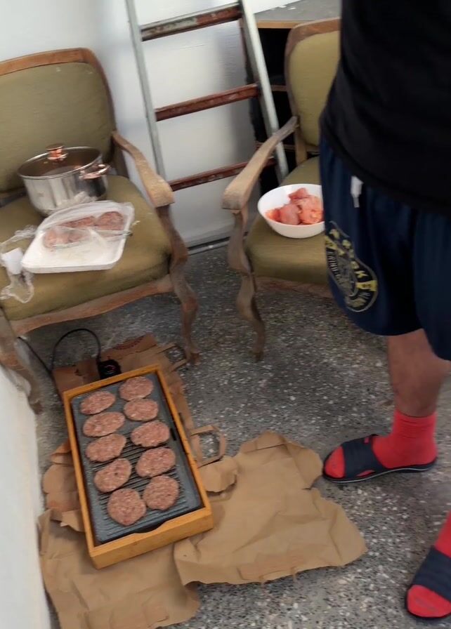 The video showcases a scene that transitions from an indoor to an outdoor setting. Initially, it focuses on a chair inside a room. On the chair are a pot and a package of meat. A small electric grill filled with hamburger patties sits on the floor, positioned on a brown paper bag. The camera then moves to a person walking on a balcony, wearing red socks and sandals. The scene then shifts to a hookah on a small silver table, with a bowl containing charcoal. The final shot presents a wide view from the balcony, revealing a cityscape with buildings, green spaces, and trees. A mountain range is visible in the distance under a blue sky dotted with clouds.