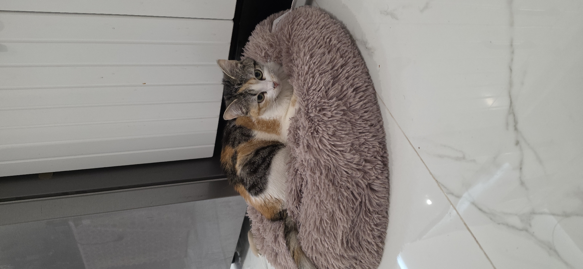 The image depicts an indoor scene located in Kazanlak, Bulgaria. A domestic cat with a calico coat, featuring patches of white, orange/brown, and dark grey/black fur, is lying down within a circular, plush, light brown/mauve pet bed. The cat's head is oriented slightly towards the right, and its eyes are light green. The pet bed rests on a white tiled floor with a subtle grey veining pattern and visible light-colored grout lines. In the background, a dark grey, possibly metallic-finished appliance or structure is partially visible on the left side, while a white, vertically paneled cabinet door or wall is present on the right. No human subjects are visible.