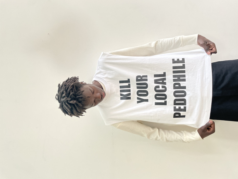 A person is holding up a white t-shirt with the words "KILL YOUR LOCAL PEDOPHILE" printed in large black block letters. The person is wearing a long-sleeved shirt underneath the t-shirt and has dreadlocks. They appear to be standing against a plain wall, and the image is slightly rotated. The person's head is tilted down, and their eyes are closed.