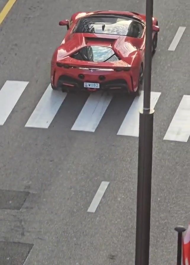 From an elevated perspective, a red Ferrari SF90 Spider is shown stopped on a gray asphalt road, straddling a white pedestrian crossing