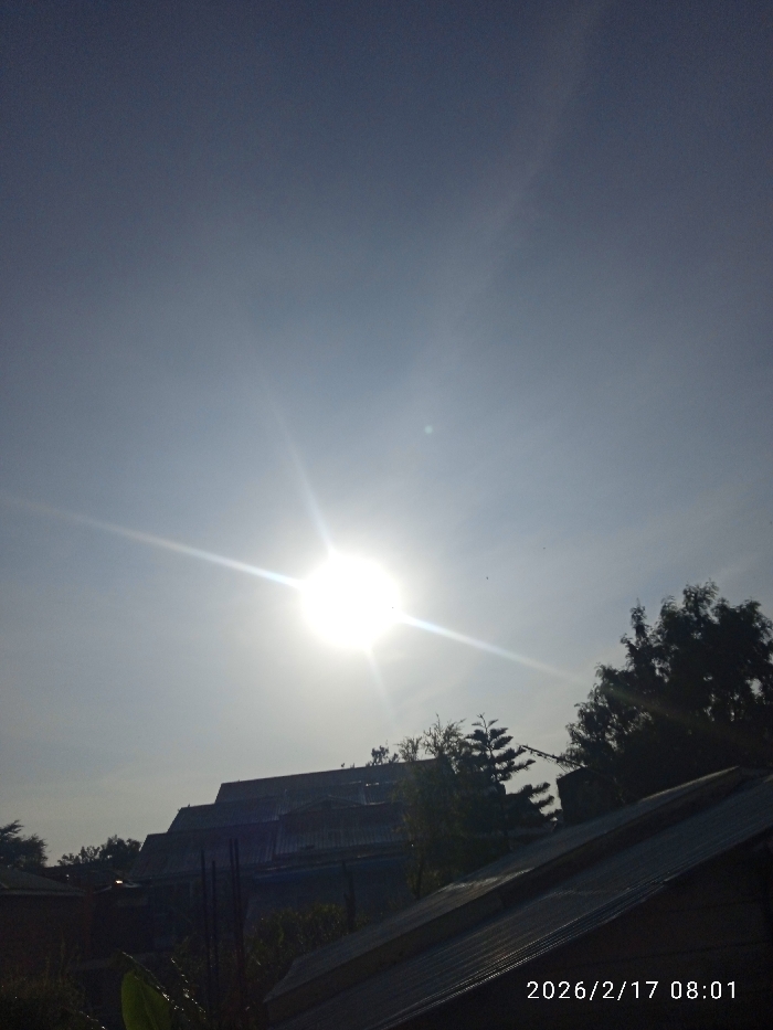 A bright sun shines in a hazy sky. Silhouetted rooftops and treetops fill the lower portion of the frame. A multi-tiered building is visible, along with vegetation. The lower right corner shows a corrugated metal roof. The time and date "2026/2/17 08:01" are printed at the bottom right corner.