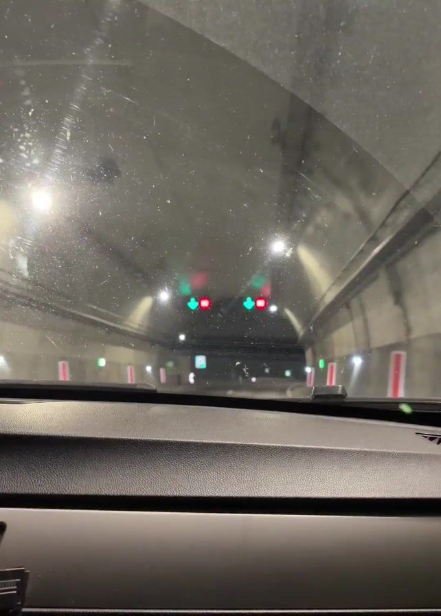 A car exits a tunnel. The view is from the driver’s seat looking forward through a dirty windshield. The tunnel lights are spaced regularly. The traffic lights are green and red. Signs hang above. Outside the tunnel, the scene is dark with streetlights. The driver continues along the roadway.