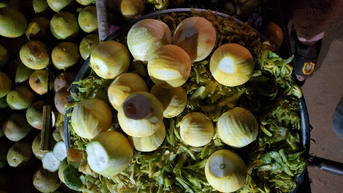 The image captures a market stall scene in Akwanga, Nigeria. A large, dark, circular basin contains approximately 15-20 peeled and partially peeled citrus fruits, predominantly yellow-orange, resting on a dense bed of their discarded green and yellow rinds. Several of the peeled fruits exhibit cut surfaces or removed sections. In the background, a substantial quantity of unpeeled green and yellowish-green fruits, consistent with oranges or grapefruits, is piled. Two circular slices of a light-colored vegetable, possibly cucumber, and a dark, rectangular object are visible within this background fruit pile. A human foot, wearing a dark sandal with an orange-yellow accent, is partially visible at the bottom right, positioned on a dark, unidentifiable surface near the base of the basin. The scene is illuminated, casting some shadows.