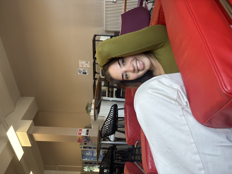 The image depicts an indoor common area or lounge at the Université de Strasbourg, France. A young adult female is seated in a bright red upholstered armchair, positioned in the lower-right and central foreground. She has medium-brown hair and is wearing a long-sleeved olive-green top and light-colored trousers. She is smiling broadly at the camera with her tongue extended. Her right arm is raised, with her hand resting partially obscured behind her head. In the background, against a neutral beige wall, several vending machines are visible on the left, next to high-top tables with black-patterned bar stools. A prominent structural pillar stands centrally. Posters, including one partially visible at the top stating "Université de Strasbourg," and informational sheets are affixed to the wall. Further to the right, black shelving units, a white radiator, and a purple chair are present. The ceiling features linear fluorescent lighting fixtures and exposed utility trunking.