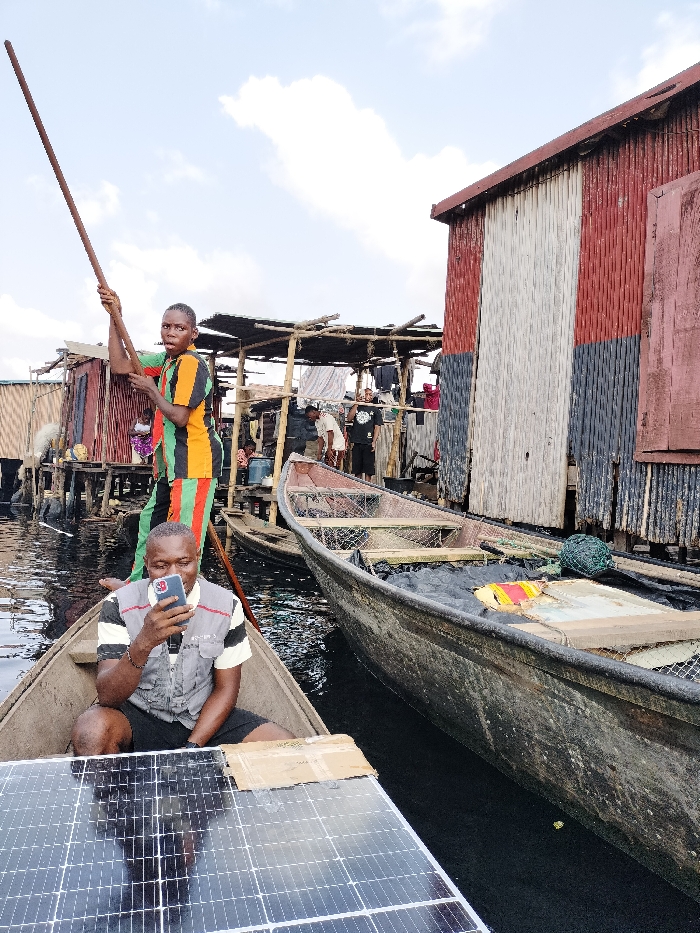 This image captures a waterside scene in Iwaya, Nigeria, featuring two men in wooden dug-out canoes amidst stilted structures. In the foreground, a man sits in a canoe, wearing a grey vest over a striped shirt and dark shorts, holding a black smartphone with both hands and looking down at its screen. A rectangular solar panel is positioned horizontally in front of him in the canoe. Directly behind him, a second man stands in a separate wooden dug-out canoe, propelling it with a long wooden pole. This man wears a vertically striped shirt and trousers in green, red, orange, and black, and has an alert expression, looking slightly upward and to the right. The midground canoe contains fishing nets and dark material, possibly covered by a tarp, with a green net or buoy visible in the water alongside it. The background consists of numerous stilted buildings constructed from wood and corrugated metal sheets, standing above dark water. One prominent building on the right features vertical panels of red, white, and dark grey/blue corrugated metal. Clothes are visible hanging to dry between the background structures, where several indistinct figures are also present. The sky is partly cloudy.