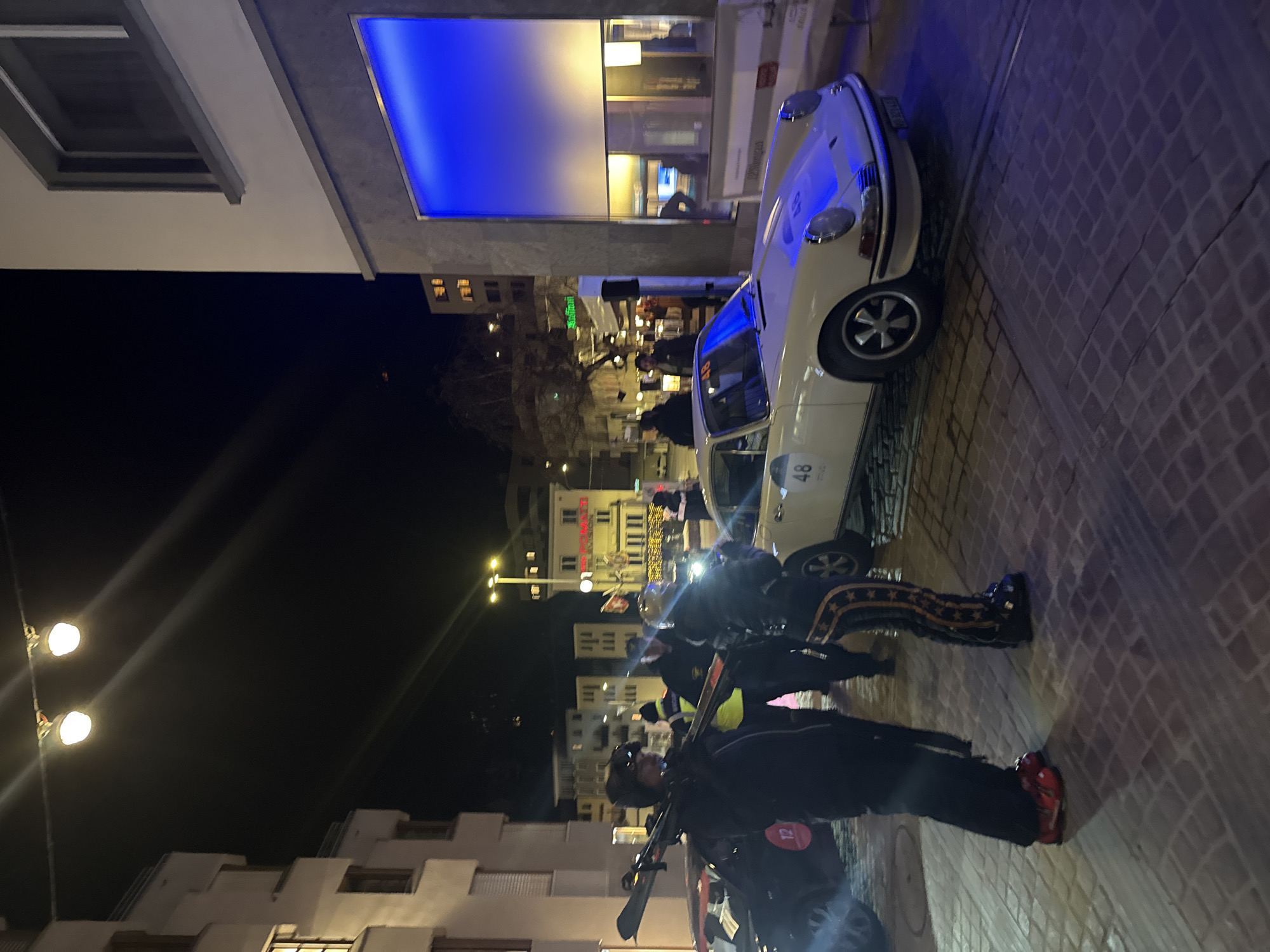 The image depicts a nighttime street scene in Sankt Moritz, Switzerland, likely during a winter event. In the immediate foreground, a person in dark winter attire, including red ski boots, stands facing right, carrying a pair of skis over their left shoulder. To their right, another individual is partially visible, wearing dark pants with gold star patterns and dark boots. A vintage white Porsche 911 coupe, bearing the number "48" on its hood and driver's side door, occupies the mid-ground, positioned on a cobblestone street. The front of the car is illuminated by a prominent blue light emanating from a large vertical display on the adjacent building's facade. This building, on the right, features a light-colored upper section with a dark-framed window, and a darker base with the aforementioned blue-lit display. To the left, another building with a light facade and multiple windows is visible. A dark-colored vehicle with a red "12" decal is partially visible behind the person carrying skis, parked on what appears to be a snow-covered patch of ground. Several individuals in the background, some wearing high-visibility vests, are clustered near this vehicle and further down the street. Overhead, a string of warm white lights hangs diagonally across the upper left of the frame. The background reveals additional illuminated buildings, including one with decorative yellow string lights. The overall environment is an urban setting at night, characterized by artificial light sources and the presence of both event participants and organized personnel.