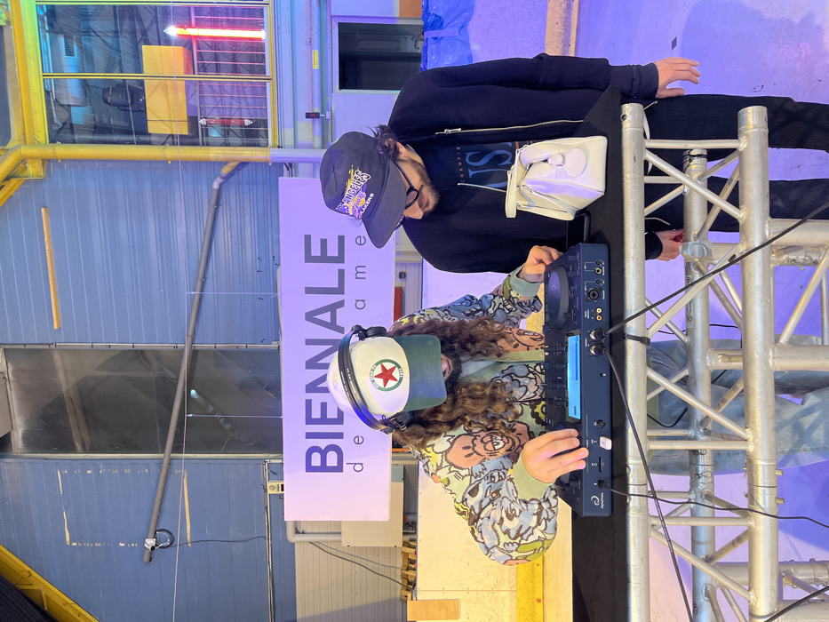 An indoor event space, likely an exhibition hall or converted industrial building, is depicted in Saint-Ouen-sur-Seine, France. The background features blue corrugated metal walls, yellow structural beams, exposed piping, and a prominent white banner displaying "BIENNALE de game" in dark lettering. An elevated glass-enclosed booth is visible in the upper right. The floor and lower structures are illuminated with purple light. Two adult males are in the foreground. The male on the left, with long, curly dark hair and a beard, wears a white and green baseball cap with a red star logo, black over-ear headphones, a multi-colored patterned jacket, and light-colored pants. He actively operates a dark blue DJ mixer/controller on a black-draped table, manipulating its knobs and jog wheels with both hands. A white USB drive is inserted into the front of the DJ unit. The male on the right, with short dark hair, wears black-rimmed glasses, a dark baseball cap with a yellow "Los Angeles Lakers" logo, a dark bomber jacket over a dark t-shirt (partially visible text "US"), and dark pants. He stands beside the first male, observing the DJ equipment. A white, structured handbag with a top handle rests on the table next to him, with a dark smartphone partially visible beneath it. The table is supported by a silver metal truss structure.