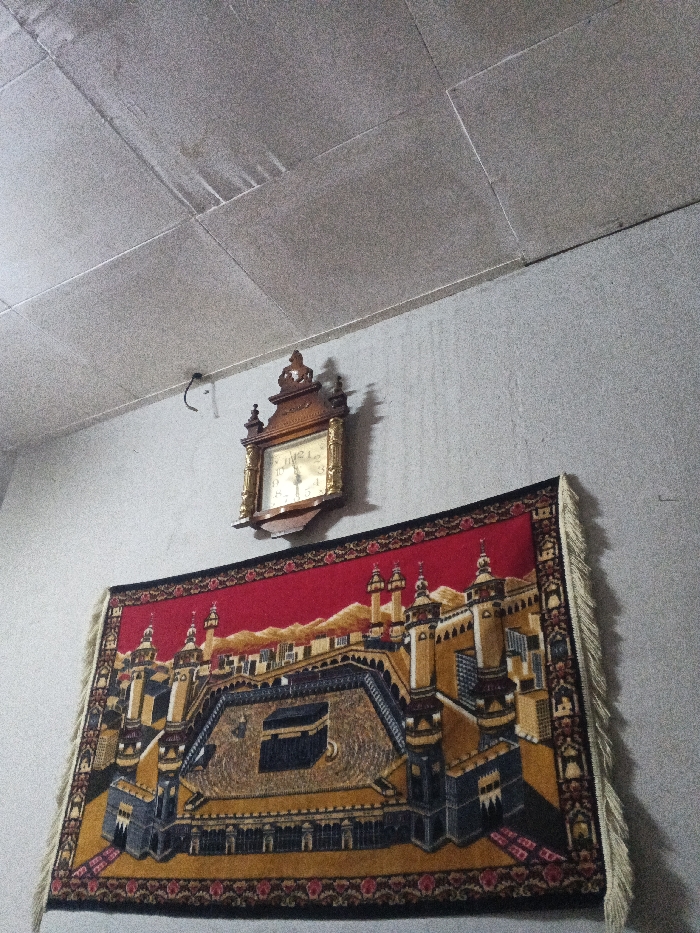An interior view of a room in Ciherang, Indonesia, presents a light gray, textured wall with two primary mounted objects. Centered on the wall is an ornate, carved wooden wall clock featuring a golden frame around a white face with black Roman numerals, indicating approximately 12:11. Directly beneath the clock, a large, rectangular tapestry or prayer rug is affixed to the wall. This rug displays an intricate, stylized depiction of the Masjid al-Haram with the Kaaba in Mecca, rendered in predominant red, gold, black, and beige tones, with visible fringes along its vertical edges. Above the clock, near the junction of the wall and ceiling, exposed black electrical wiring is visible. The ceiling is constructed from multiple light-colored, rectangular panels, some of which exhibit minor staining and creasing.