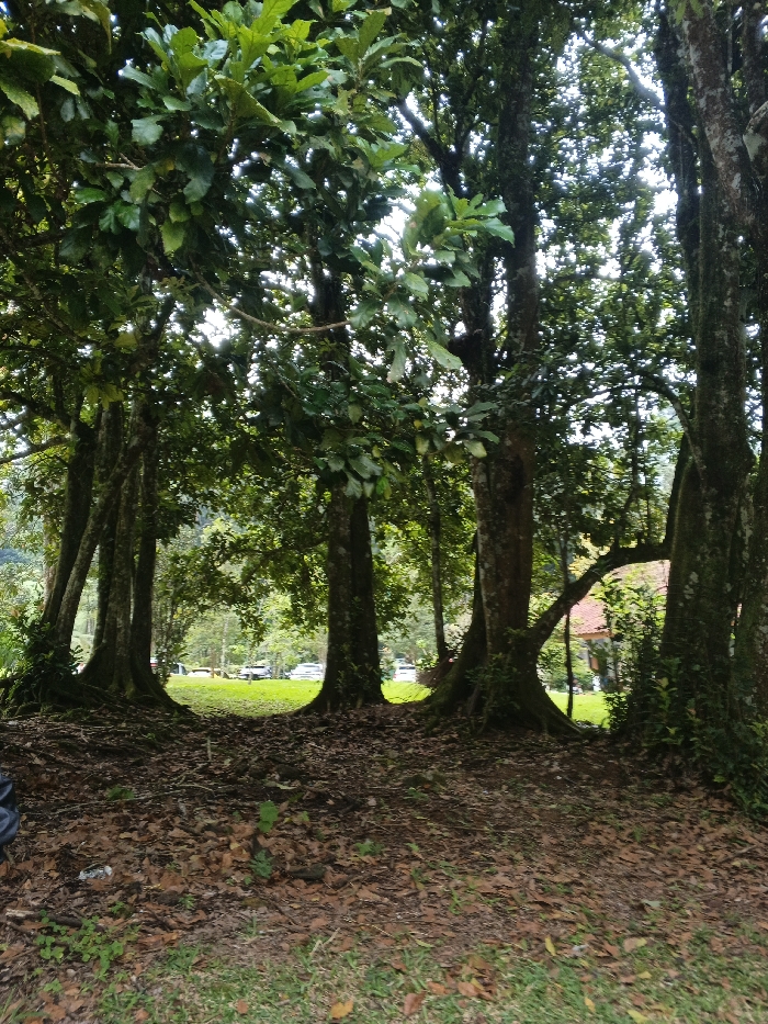 The image depicts an outdoor scene within the city of Kwekwe, Zimbabwe, characterized by a semi-wooded environment. The foreground consists of a dirt ground largely covered with dry, brown fallen leaves, interspersed with patches of green grass and exposed tree roots. On the far left, a dark, ambiguous object is partially visible on the ground. A line of mature trees with thick, textured, dark-barked trunks and dense canopies of green leaves dominates the midground. Sunlight filters through the foliage, creating varied light conditions. Between the central trees, an opening reveals a brighter area. Through this opening, a manicured green lawn is visible, upon which several light-colored vehicles (likely cars) are parked. To the right, behind the trees, a building with an orange-red tiled roof and light-colored walls is partially visible. The background features distant hills or dense natural vegetation under a bright, diffused sky mostly obscured by the tree canopy. No individuals or discernible actions are present.