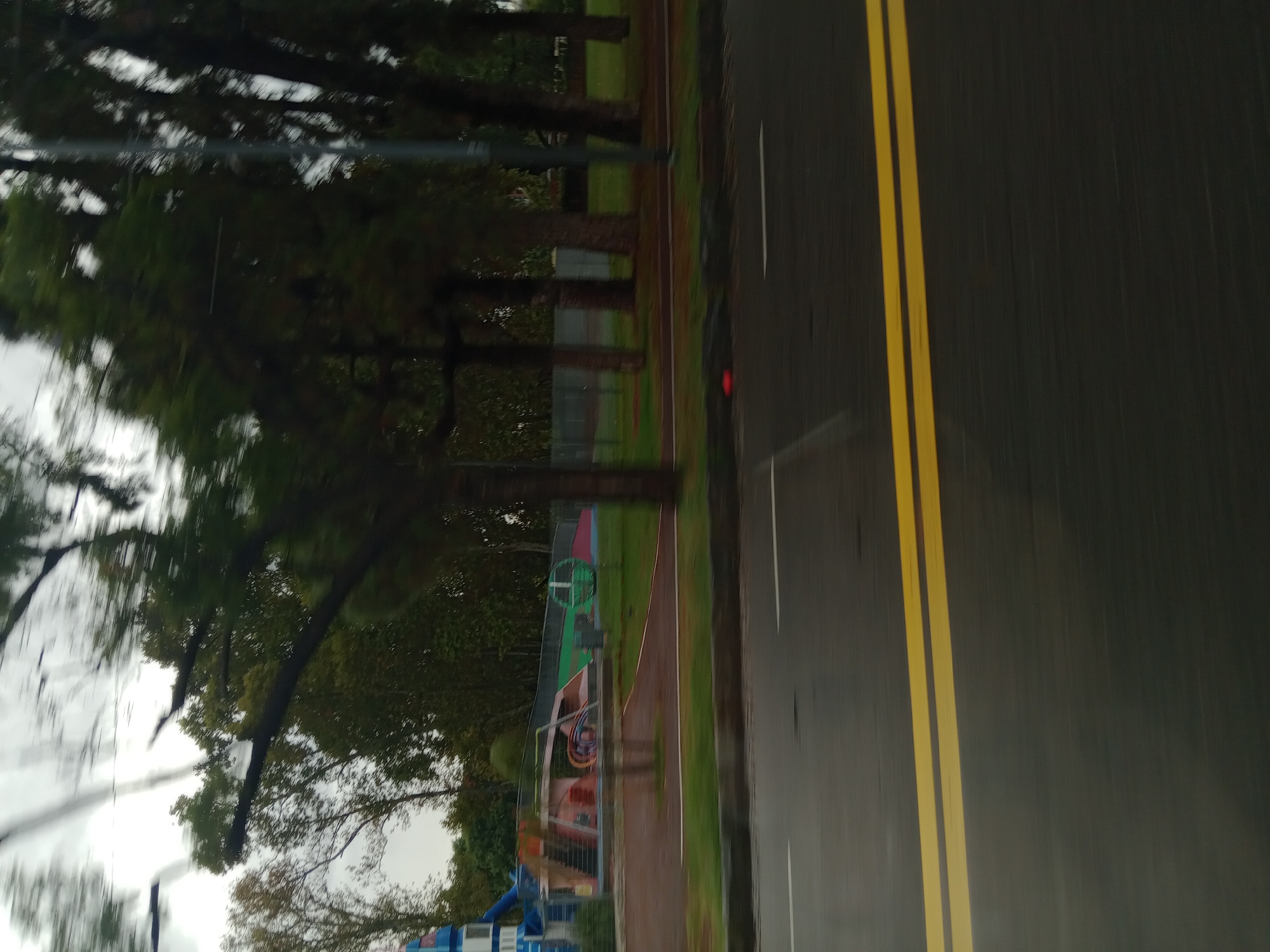 The image depicts an exterior scene captured from a moving vehicle, showcasing a wet asphalt road adjacent to a public park under an overcast sky