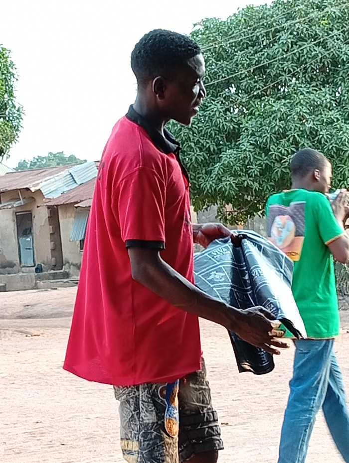 The image depicts an outdoor scene in Gboko, Nigeria, featuring two males. In the foreground, a dark-skinned male with short, dark hair wears a red collared shirt with a black trim and camouflage-patterned shorts. He holds a folded black item with white geometric patterns in both hands, angled downwards, and looks towards the right of the frame with his mouth slightly open. In the background, to the right, another dark-skinned male is partially visible, walking away. He wears a green short-sleeved shirt with a graphic design on the back and blue jeans, with his right hand raised near his face. The ground is unpaved, appearing as light brown dirt or sand. Behind the subjects, dense green foliage from large trees is visible, along with two rustic structures featuring light-colored walls and rusty corrugated metal roofs.