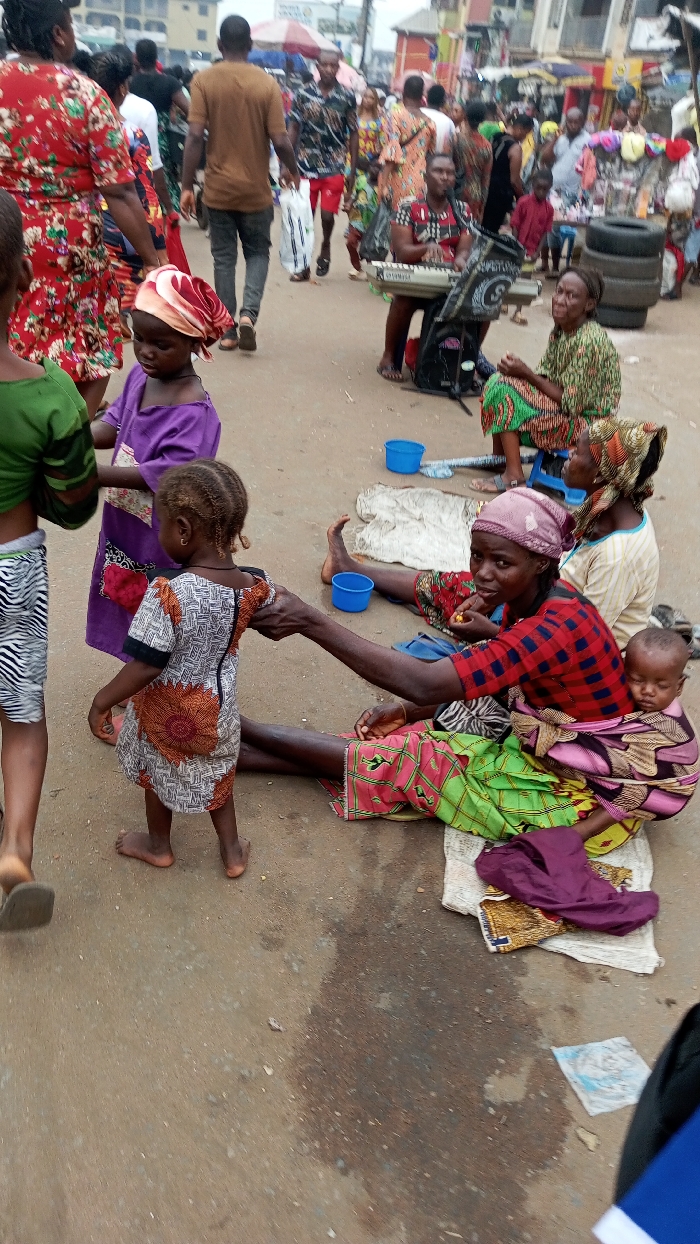 This image depicts a bustling street scene in Onitsha, Nigeria. In the foreground-center, a woman, wearing a red plaid shirt, a green and pink patterned wrapper, and a light pink headwrap, sits on the bare ground, which is a mix of dirt and concrete with some wet patches. A baby, swaddled in a pink and purple patterned cloth, is secured and sleeping on her back. The woman extends her right arm, holding the hand of a young, barefoot child who wears a patterned dress with an orange circular motif and stands facing partially away from the camera. To the left of this interaction, another barefoot child, wearing a purple top and a patterned headwrap, stands looking downwards. A third child, partially visible on the far left, walks out of the frame wearing a green top, black and white striped shorts, and a single flip-flop on the visible foot. Near the seated woman and children are three blue plastic bowls placed on the ground. In the midground, slightly to the right, an adult male dressed in a dark patterned shirt sits, playing a light-colored Yamaha electronic keyboard. A dark bag rests beside the keyboard on the ground. Behind him, another woman, wearing a green patterned dress and a headwrap, sits on the ground, observing the scene. The background shows a densely populated area with numerous pedestrians walking in various directions, distant buildings, and market stalls with goods such as clothing racks and stacked tires. The overall environment indicates a busy outdoor market or commercial street during daylight hours.