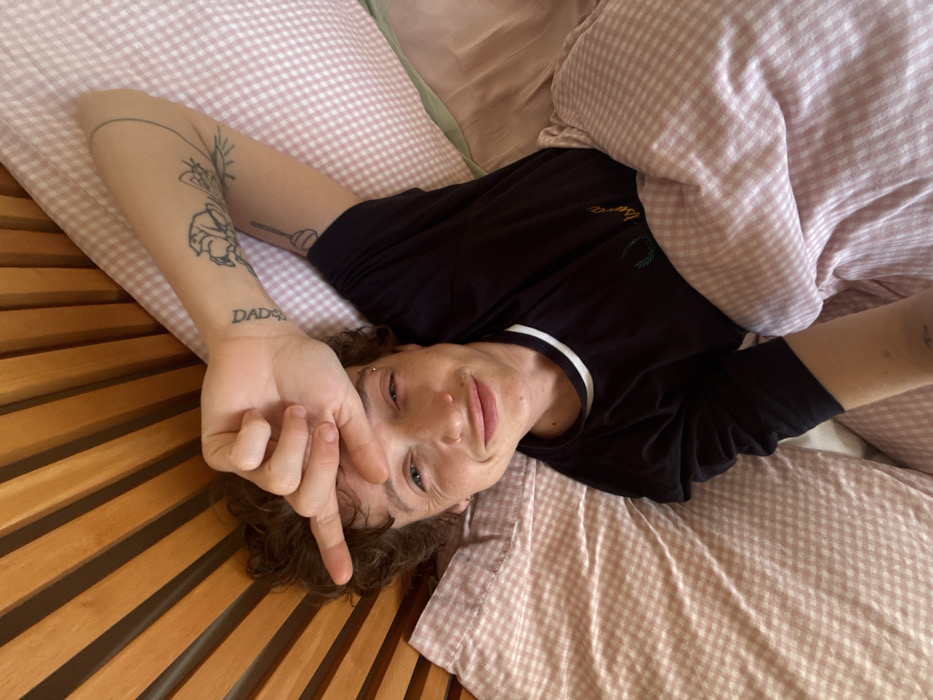 A single individual is depicted lying in a bed, stated to be located in Brighton, United Kingdom. The person has curly brown hair and an ambiguous gender presentation. Facial features include a small stud piercing in the right nostril and two small stud piercings above the left eyebrow. The subject is smiling slightly, with their left eye appearing partially closed. The left hand is raised, forming a V-sign with the index and middle fingers, partially obscuring the forehead and right eye. Tattoos are visible on the left arm: the word "DADDY" on the forearm, and outline designs resembling a rose, a leafy branch, and a lollipop further up the arm. The individual wears a dark long-sleeved shirt with a white and dark striped collar and a green embroidered logo on the left chest, consistent with a Fred Perry design. The bedding consists of light pink and white gingham-patterned pillows and a duvet. A light-colored wooden slatted headboard is visible in the background.