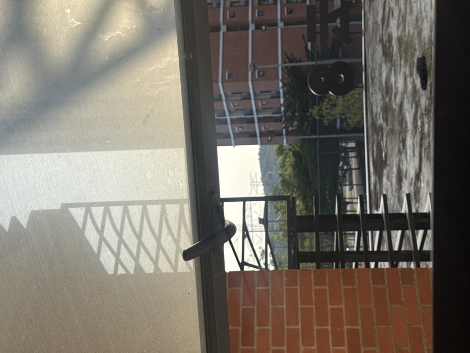 A view through a window reveals a brick building, trees, and electrical towers. The window is partially covered with a light-colored screen casting geometric shadows on the glass. A metal window handle is visible on the right side of the frame. An additional brick wall and metal fence are seen outside the window. The scene is brightly lit, with shadows adding depth.