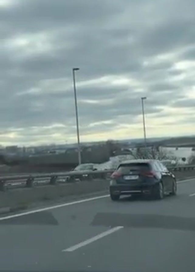 view from inside a car driving on a highway on a cloudy day. Several other cars are visible on the road. On the right side of the highway, there is a river or body of water with bare trees on the banks. Streetlights line the side of the road. In the distance, a city skyline is visible. The camera remains steady throughout the video.