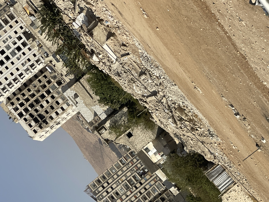 The image depicts a devastated urban landscape within Al-Qaboun Municipality, Syria, captured at an oblique angle. The foreground consists of an expansive, reddish-brown dirt or compacted earth lot, sparsely scattered with small pieces of debris. Elevated beyond this lot is a substantial pile of concrete rubble, broken stones, and construction debris, consistent with destroyed structures. In the mid-ground, two multi-story buildings stand prominently. The building on the right is a heavily damaged high-rise, exhibiting numerous blown-out window openings, widespread façade damage, and distinct dark scorch marks around several apertures. The building on the left, slightly further back, is also a multi-story structure with numerous missing window panes and visible wear, though it appears less extensively scorched than its counterpart. Between and in front of these taller structures are several smaller, partially ruined or uncompleted buildings constructed from concrete blocks. Sparse green vegetation, possibly small trees or bushes, is interspersed among the rubble and smaller structures. The background features a clear, light blue sky above a distant, barren, light-colored mountain range. No individuals, vehicles, or discernible activities are present in the scene.