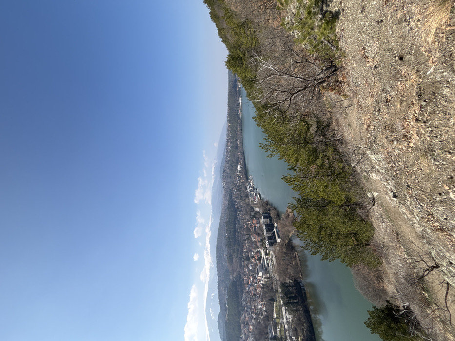 The image captures a panoramic, elevated view of the Pancharevo region in Bulgaria under a clear, bright blue sky. The foreground, primarily occupying the bottom and right portions, consists of a steep, rocky hillside covered with light brown earth, scattered loose gravel, dry leaf litter, and sparse vegetation. Evergreen pine trees with dark green needles are visible on the slope, interspersed with several bare deciduous trees exhibiting intricate branch structures. In the midground, a wide, tranquil body of greenish-blue water, identified as Pancharevo Lake and the Iskar River, curves through the landscape. Along the river's left bank, the town of Pancharevo extends, characterized by numerous low-rise buildings, including residential structures with varying roof colors (predominantly red and light-colored), and several larger, more modern multi-story buildings situated closer to the waterfront. Urban infrastructure such as roads and developed green areas are also discernible within the townscape. The background features a succession of rolling, forested hills that transition into a distant range of prominent snow-capped mountains, positioned beneath a clear sky with a few wispy white clouds near the horizon. No individuals or specific activities are observable within the depicted scene.