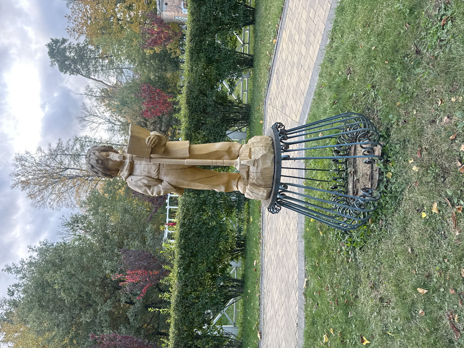The image displays a detailed wooden sculpture of a young boy situated in a park in Irpin, Ukraine