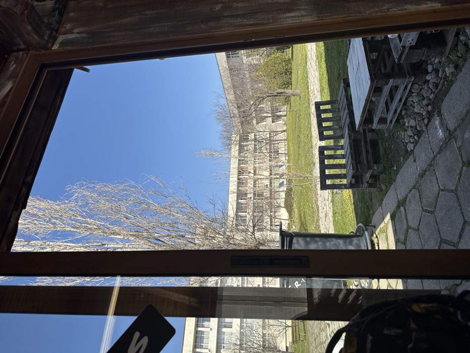 The image displays an exterior view, observed from within a structure, in Sliven, Bulgaria. The perspective is through a wooden-framed opening, showing a partial view of a dark object, possibly a backpack, in the lower left foreground, and a reflection of a black rectangular item with a white 'S' character on the glass or frame. Immediately outside, a hexagonal paved pathway transitions to a gravel area. Situated on the gravel are three pieces of outdoor furniture constructed from weathered wooden pallets: two chairs and one table. A tall, dark cylindrical waste receptacle stands to the left of the paved path. The ground is covered with grass, exhibiting both green and senescent patches, consistent with late winter or early spring. Several bare deciduous trees, characterized by light-colored trunks and branches, are scattered across the grassy area. In the mid-ground and background, multiple multi-story institutional-style buildings are visible. These structures feature numerous rectangular windows and appear to be constructed from light-toned concrete or stucco. The sky above is clear and uniformly bright blue, indicating fair weather. No individuals are present within the observable scene.
