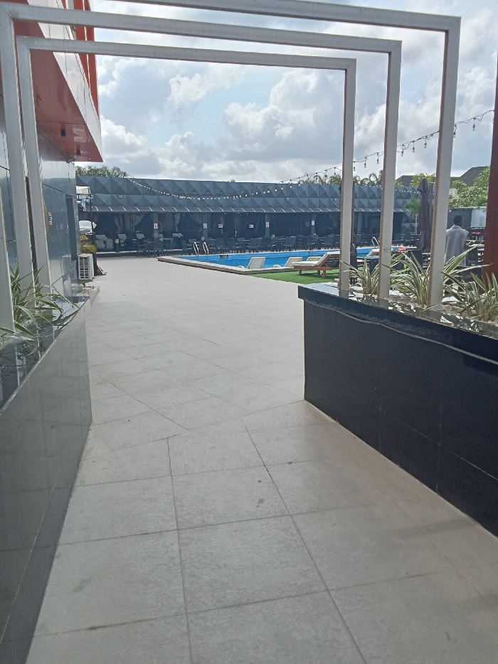 view through a white frame structure, looking out to an outdoor area. The frame is constructed from three white rectangular beams, forming a rectangular shape. The frame is positioned between a black wall to the left and a black wall with a dark grey tiled surface to the right. The outdoor area is visible through the frame. The tiled surface is light grey, with a smooth finish. The outdoor area has a blue swimming pool in the center. The pool has a black tiled border and is surrounded by a grassed area. There are three black rectangular sunbeds on the grass to the right of the pool. A row of dark grey rectangular structures are seen in the background, likely covered by some form of fabric. The image captures a section of the surrounding environment in Ujevwu, Nigeria, with the coordinates of 5.472 latitude and 5.817 longitude. One person is visible in the background to the right, standing close to a black structure, partially obscured by a large potted plant. The person appears to be wearing a white shirt and has dark hair. There is a string of white lights running horizontally across the top of the dark grey structures. The sky is visible in the background, with a few clouds in the sky.