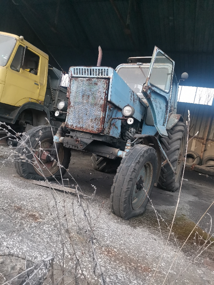 The scene, located in Zhivkovo, Bulgaria, depicts a derelict industrial area. In the foreground and center, a weathered light blue tractor, possibly a DT-75 model, stands with its front grille heavily rusted and an exposed, rusty exhaust pipe. The tractor's right-side cab door is open, and both its front right and rear right tires are deflated. To the left and partially obscured behind the tractor, a yellow truck, possibly a ZIL or MAZ model, is visible, also showing signs of age and disrepair. Both vehicles are positioned under a dark, possibly corrugated metal, roof structure, indicative of a large shed or workshop. The ground consists of cracked asphalt or concrete mixed with dirt and sparse, dry vegetation in the immediate foreground. In the background to the right, a stack of worn vehicle tires is visible against a brighter exterior, suggesting an opening in the building structure. No individuals are present in the image, and no active operations are occurring.