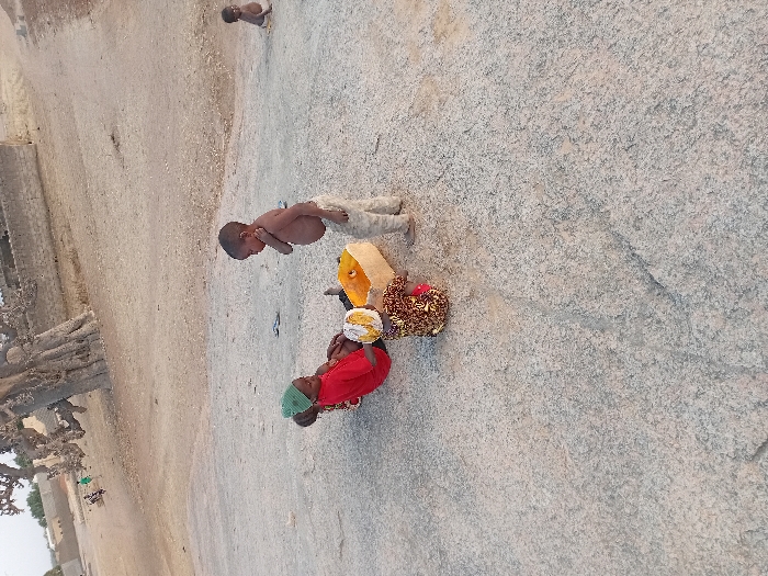Three children play on a large gray rock. One child, shirtless and in tan pants, stands nearby. Another child, wearing a red shirt, sits next to a woman whose head is covered. An open yellow container sits between them, along with a decorated, possibly beaded object. In the background, there is a dry, sandy landscape with sparse vegetation and simple structures.