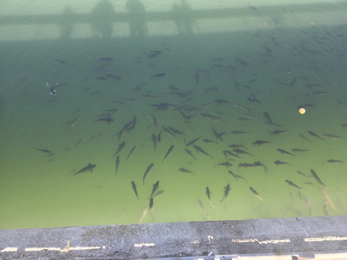 An overhead view captures a segment of a greenish-brown body of water, likely the Maritsa River, observed from a structure within the city of Plovdiv, Bulgaria. The left side of the frame features a weathered concrete retaining wall or bank. The water's surface displays ripples and a distinct shadow pattern of a grid-like structure, indicative of an overhead bridge or railing. Approximately 150-200 small to medium-sized, dark-colored fish are scattered throughout the water, swimming in various directions. A single, small, round, yellowish object, possibly a food particle, floats on the water's surface in the lower-right quadrant. The scene is illuminated by bright daylight.