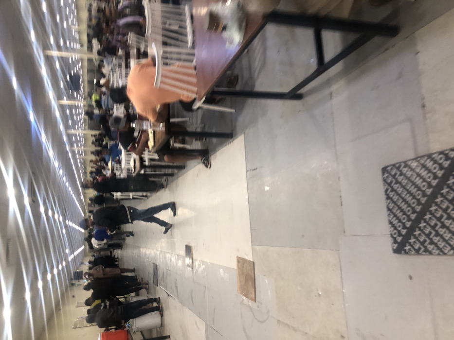 A long, brightly lit room is filled with rows of tables where people are sitting and eating. The tables have metal frames and wooden tops, with white chairs around them. People are walking through the aisle between the tables. A stack of boxes with the word "POWERPLEX" printed on them sits to the right, and the floor is made of light-colored tiles. The perspective creates a sense of depth, drawing the eye to the end of the room.