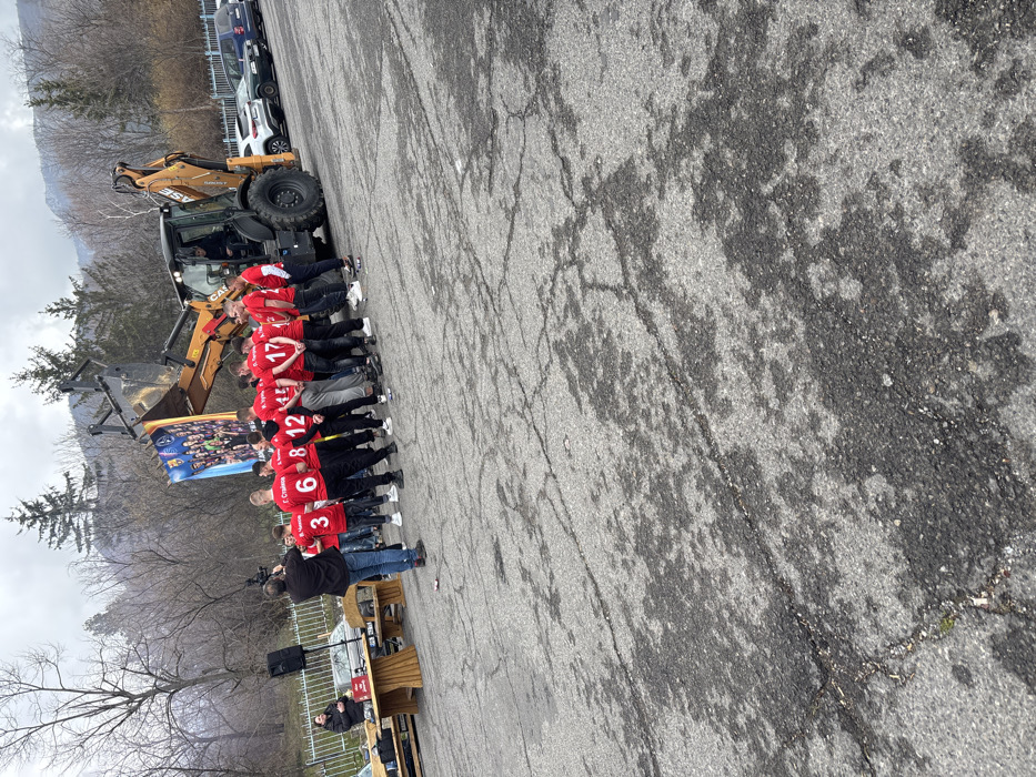 The image portrays an outdoor event occurring on a cracked asphalt surface in Sopot, Bulgaria, under an overcast sky. Approximately fifteen young adult males, primarily seen from behind, are arranged in an informal formation. They are uniformly dressed in red sports jerseys featuring white numbers (e.g., 3, 6, 12, 17) and Cyrillic names. The group faces a large blue banner displaying a multi-person portrait, which is elevated and supported by the front loader bucket of a yellow and black Case brand backhoe loader. An individual is visible within the operator's cab of the backhoe. To the left of the main group, a male individual in a dark jacket and blue jeans holds a camera or video recorder, pointing it towards the group. Further left, a wooden table with attached benches displays several red boxes, and a black speaker on a stand is present. A woman in a dark jacket stands near this table. The background includes bare deciduous trees, evergreen trees, distant hills or mountains, and several parked cars on the right side. The asphalt ground exhibits dark, wet-looking patches.