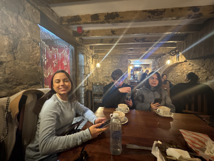 The scene depicts the interior of a rustic cafe or restaurant located in the City of Edinburgh, United Kingdom. The establishment features exposed, rough-hewn stone walls and a ceiling constructed from heavy, dark wooden beams. Dim, warm lighting emanates from spherical light fixtures mounted on the walls. In the foreground, three young adults are seated around a large, dark wooden table. On the left, a female with long dark hair, wearing a light blue long-sleeved top, smiles directly at the camera while holding a smartphone in her left hand. A beige-colored coat is draped over the back of her chair. To her right, a male with dark hair, wearing a dark top, looks downwards, manipulating an object in his hands. Adjacent to him, a second female, also with dark hair, is clad in a grey puffer jacket and holds a smartphone with both hands, looking towards the right of the frame. The table in front of the male and the second female holds four white ceramic coffee cups with matching saucers, all appearing largely empty. A clear plastic water bottle stands in the foreground on the table. A crumpled paper napkin with red and white stripes is visible on the right edge of the table. In the background, through an archway, additional patrons are visible in a more brightly lit area, possibly a service counter or bar. A distinctive decorative screen or beaded curtain with a red background and a white pattern is affixed to the stone wall on the left side of the frame. Industrial-style decorative elements, resembling metal gears, are mounted on the stone wall in the mid-background.