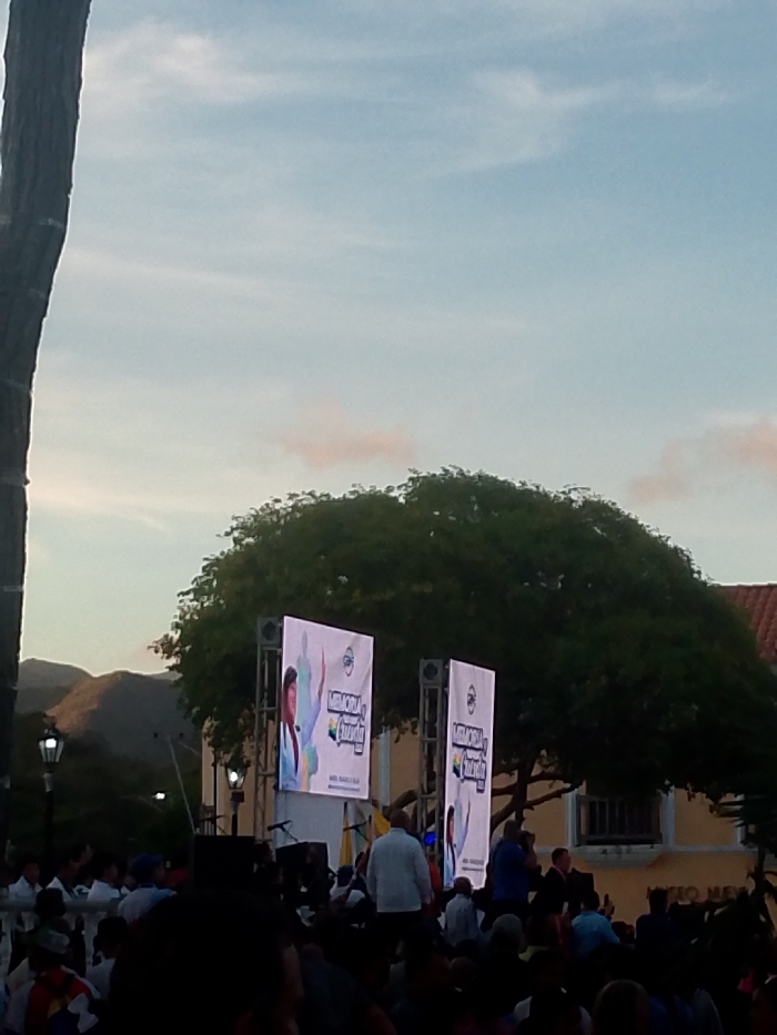 The image depicts an outdoor public gathering occurring at dusk in La Asuncion, Venezuela